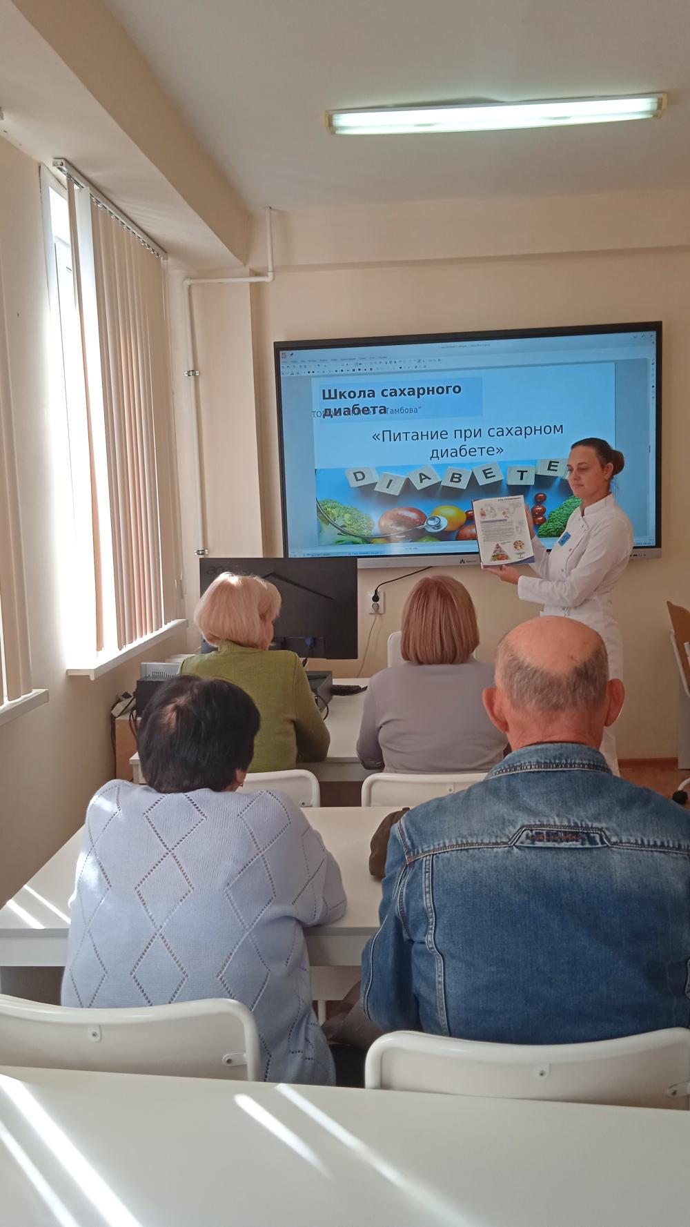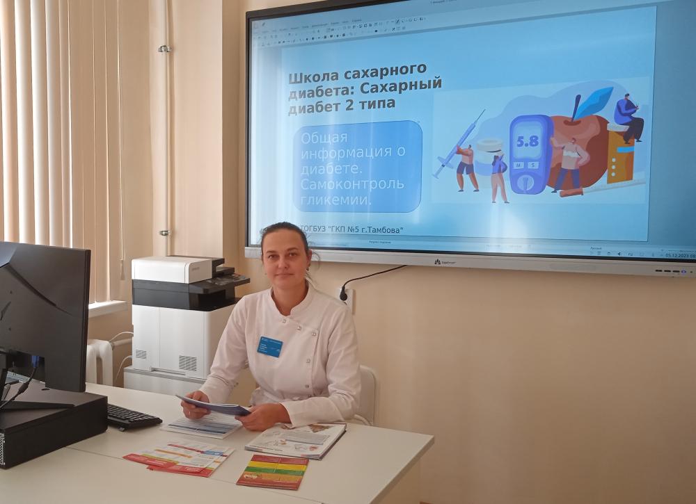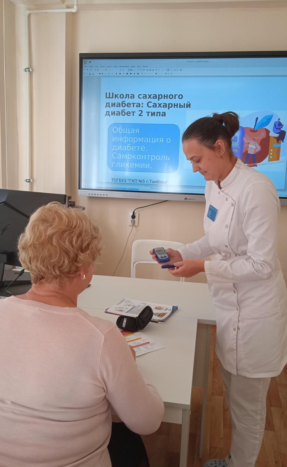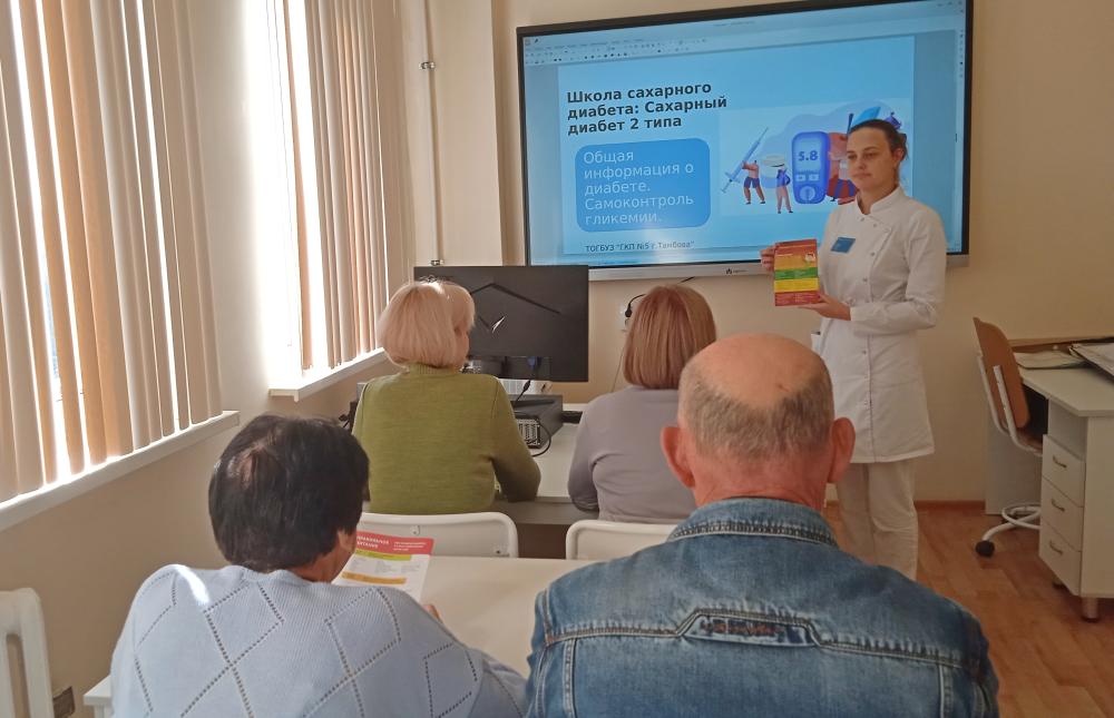 В городской клинической поликлинике № 5 г.Тамбова работает школа для пациентов с сахарным диабетом. Занятия проводятся в рамках нацпроекта «Продолжительная и активная жизнь», федерального проекта «Борьба с сахарным диабетом».