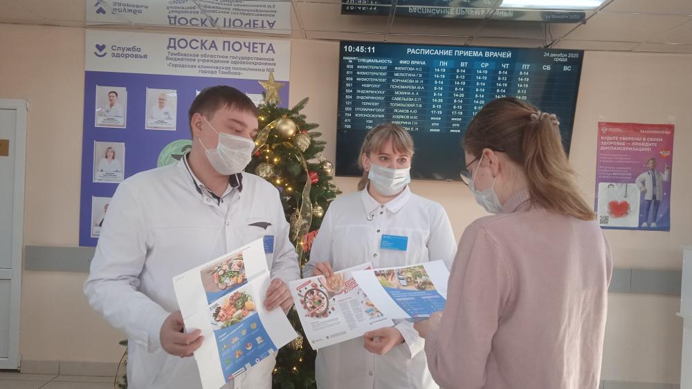 Так, в городской клинической поликлинике №5 г.Тамбова в рамках реализации нацпроекта «Продолжительная и активная жизнь» и недели популяризации здорового питания, которая проводится с 22 по 28 декабря, провели профилактические акции.