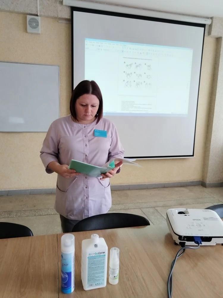 Участие в конференции приняли 60 медицинских сестёр поликлиники. В докладе была дана характеристика кожных антисептиков, гигиенической обработке рук кожным антисептиком, показан алгоритм обработки рук хирургов кожным антисептиком, алгоритм мытья рук водой и мылом.