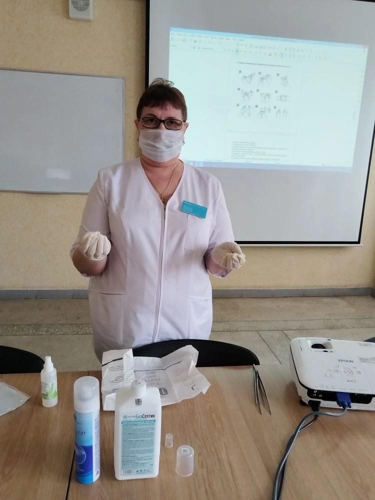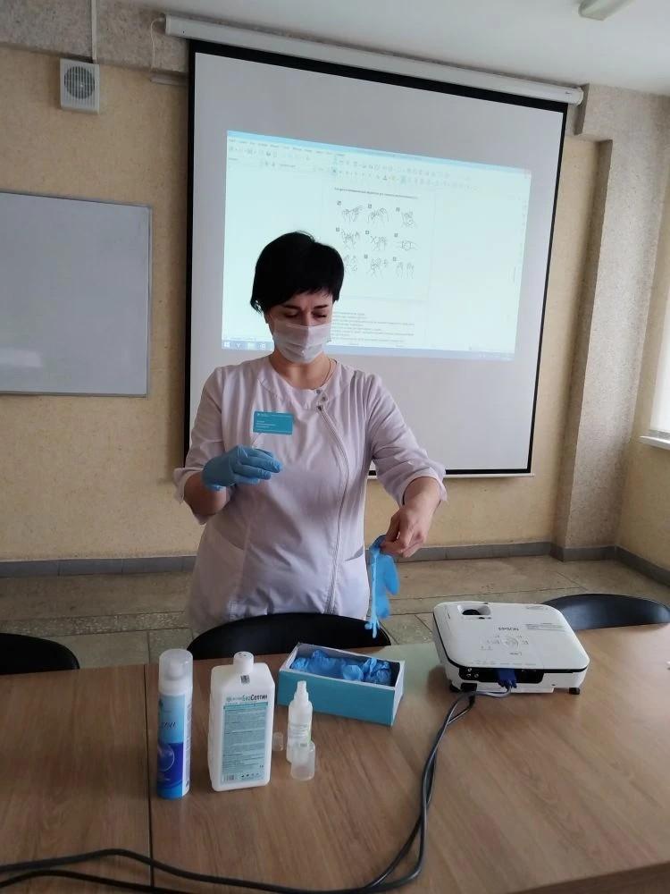 Помимо теории был дан мастер-класс. Медсёстры хирургического отделения Елена Владимировна Сорокина и Валентина Алексеевна Полежаева продемонстрировали коллегам, как правильно снимать и надевать стерильные и нестерильные перчатки, как обрабатывать руки по европейскому стандарту.